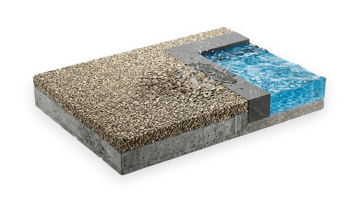 Drains through the material, runs cooler underfoot, bonds into the substrate — a fundamentally different answer to what pool decks actually deal with.