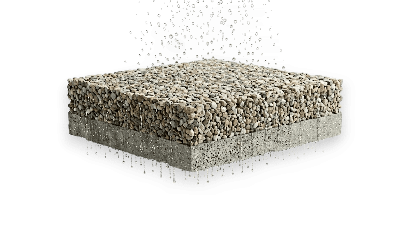 Water that drains through the material itself never pools on it, never pressurizes beneath it, and never becomes a safety or structural issue.